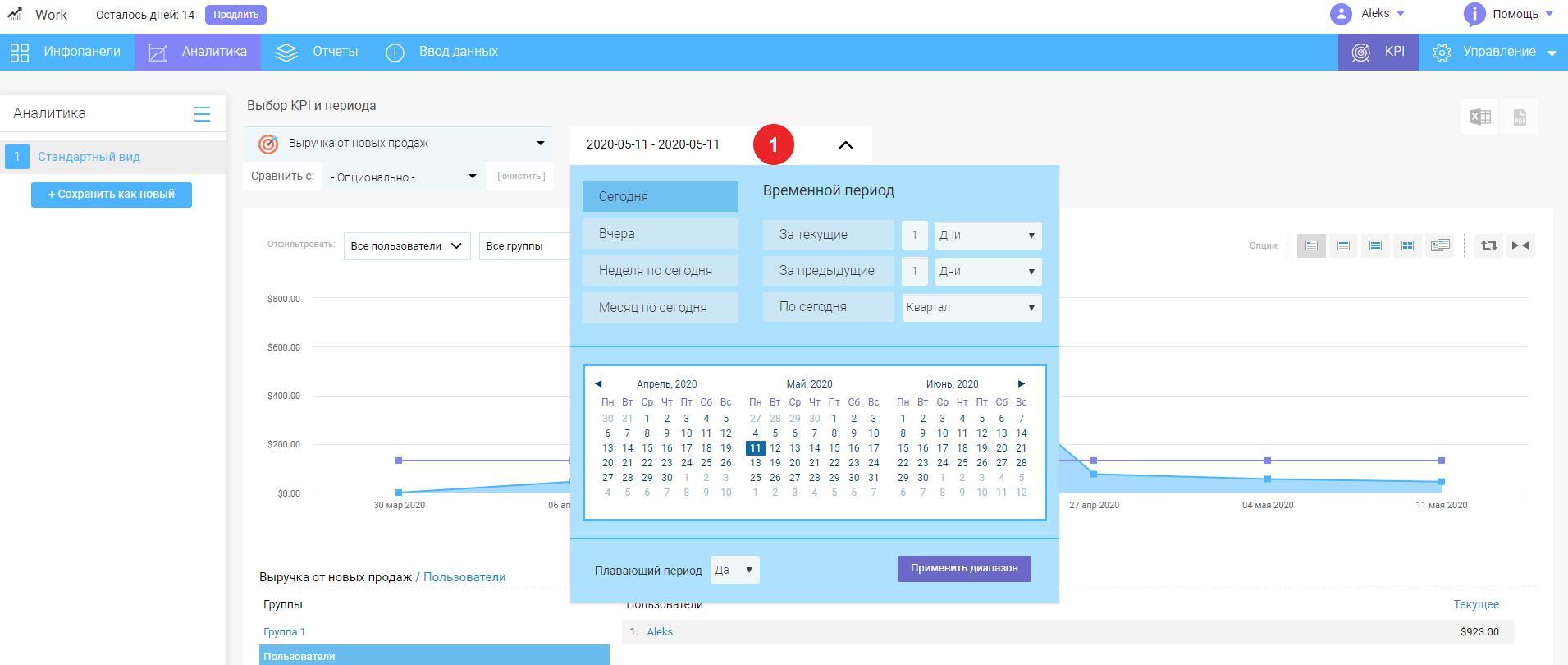 Выберите основной KPI из выпадающего списка «Выбор KPI и периода». По умолчанию в аналитике отображается суммарное (или усредненное, в зависимости от настоек KPI) значение всех данных пользователей по выбранному KPI. При необходимости отфильтруйте данные по отдельным пользователям или группам;